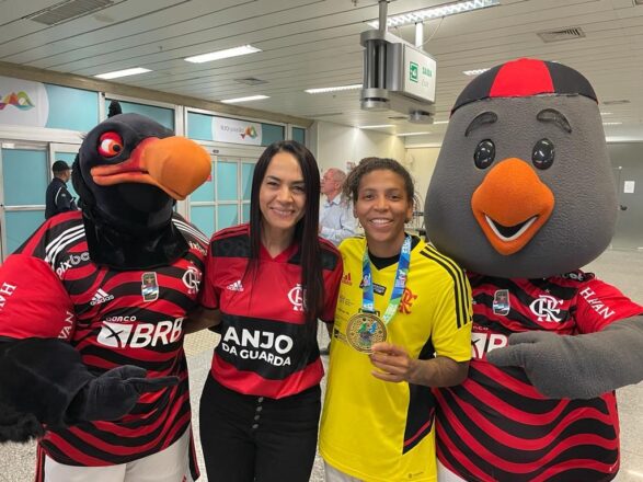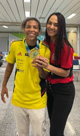 Rosicleia Canpos, head coach da equipe de judô do Flamengo, foi ao Aeroporto do Galeão, no fim de semana, dar as boas vindas a Rafaela Silva, bicampeã mundial de judô e atleta do rubro-negro, em seu retorno ao Brasil.
